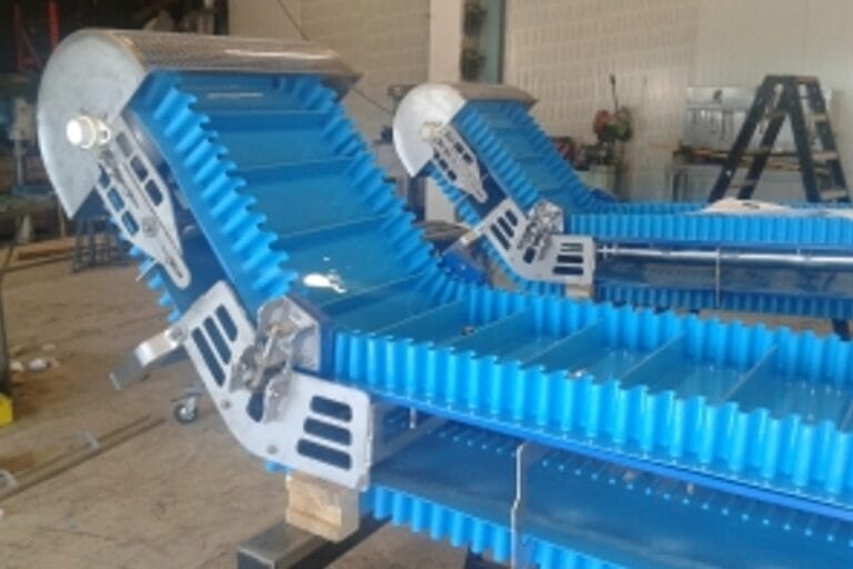 Flights or cleats can be fitted straight (90°) or angle 60° or kinked. This depending on the inclination angle of the conveyor, the amount and type of product.